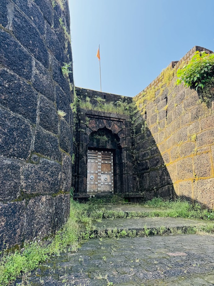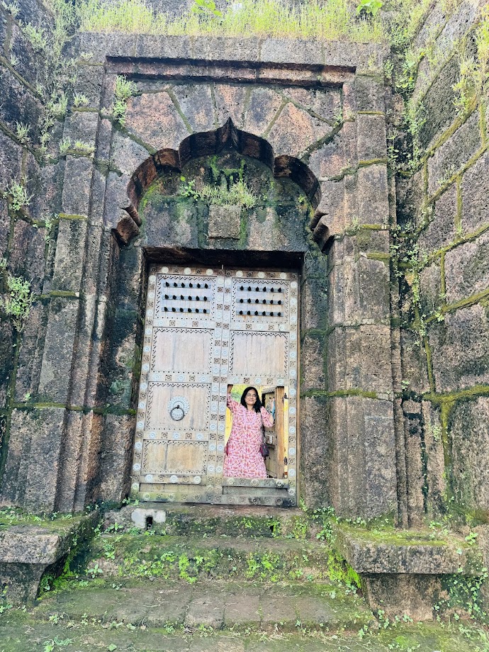 फार अंतर नसलं, तरी रस्ता खूपच अरूंद आणि कठीण, वळणावळणाचा होता. तो घाट मोठ्या मुश्कीलीने पार करत आम्ही डोंगरमाथ्यावरती पोहोचलो. तिथेच हिम्मतगढचा मार्ग दाखवणारा बाण दिसत होता. बाणाच्या दिशेने जाताच गडाचं प्रवेशद्वार दिसलं. भव्य असं देखणं पण बंद असलेलं प्रवेशद्वार बघून, अरेच्च्या आता आपल्याला आतून हा किल्ला बघायला मिळणार नाही तर असा विचार मनात चमकून गेला. जाऊदेत, कमीत कमी या प्रवेशद्वाराजवळ उभं राहून एक फोटो तरी काढू असं म्हणून मी दाराजवळ गेले, तर तिथे असलेलं छोटं दार चटकन उघडलं गेलं. आतला नजारा क्षणात दिसला. त्या छोट्या दारातून प्रवेश करताच सगळीकडे गवताने आपलं साम्राज्य वाढवलेलं दिसलं. मात्र गडाचे बुरूज, तटबंदी, वर जाण्यासाठीच्या पायऱ्या, तोफ, आतलं पिटुकलं मंदिर, असं सगळं काही होतं. जशा शहरात छोट्या फॅमिलीज फ्लॅटमध्ये राहतात, तसाच हा छोट्या कुटुंबाला राहण्यासाठी बांधलेला किल्ला असावा असं वाटायला लागलं. आता वरतून परिसराचं दृश्य बघावं म्हणून पायऱ्या चढणार तोच अपूर्व बाजूच्या दारातून तिरासारखा धावत बाहेर आला, त्याच्यामागे धप्कन असा आवाज आला. तो पळाला म्हणून मी आणि सायली दोघीही तितक्याच वेगाने जीव मुठीत धरून पळायला लागलो. थोडं दूर थांबून धापा टाकत अपूर्वला काय झालं असं नजरेनंच विचारलं. तेव्हा गवताबरोबरच माकडांचं राज्य असलेल्या त्या भागात आम्ही प्रवेश केल्यामुळे एका भल्यामोठ्या माकडाने अपूर्वला बघून घाबरून झाडावरून खाली उडी मारली होती. आणि अपूर्वने आता तो हल्ला करणारा या भीतीने त्याला घाबरून पळायला सुरुवात केली होती. तो पळतोय म्हटल्यावर आम्हीही जीव मुठीत धरून पळालो होतो. माकडाच्या भागात जायचं नाही असं ठरवून आम्ही गडाच्या पायऱ्यांनी वर गेलो. या गडाला चहू बाजूंनी वर जाण्यासाठी पायऱ्या होत्या. वर गेल्यावर खरोखरंच एका वेगळ्या जगात गेल्याचा अनुभव आला. अतिशय थंडगार झुळझुळणारा वारा, समोरच्या बाजूने दिसणारा समुद्र, वरती निळंशार आकाश, त्यापलीकडे दिसणारे हिरवेगार डोंगर आणि त्यांचं समुद्रात पडलेलं प्रतिबिंब....नजर वळवली, तर एक पांढरीशुभ्र हिरव्या रंगाच्या काठात उभी असलेली मशीदही दिसली. कितीतरी वेळ आम्ही चोहीकडून दिसणारी दृश्यं बघत राहिलो.