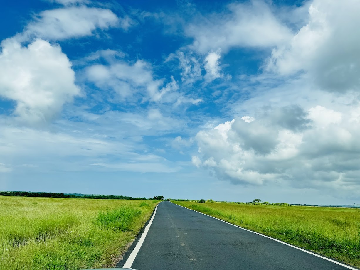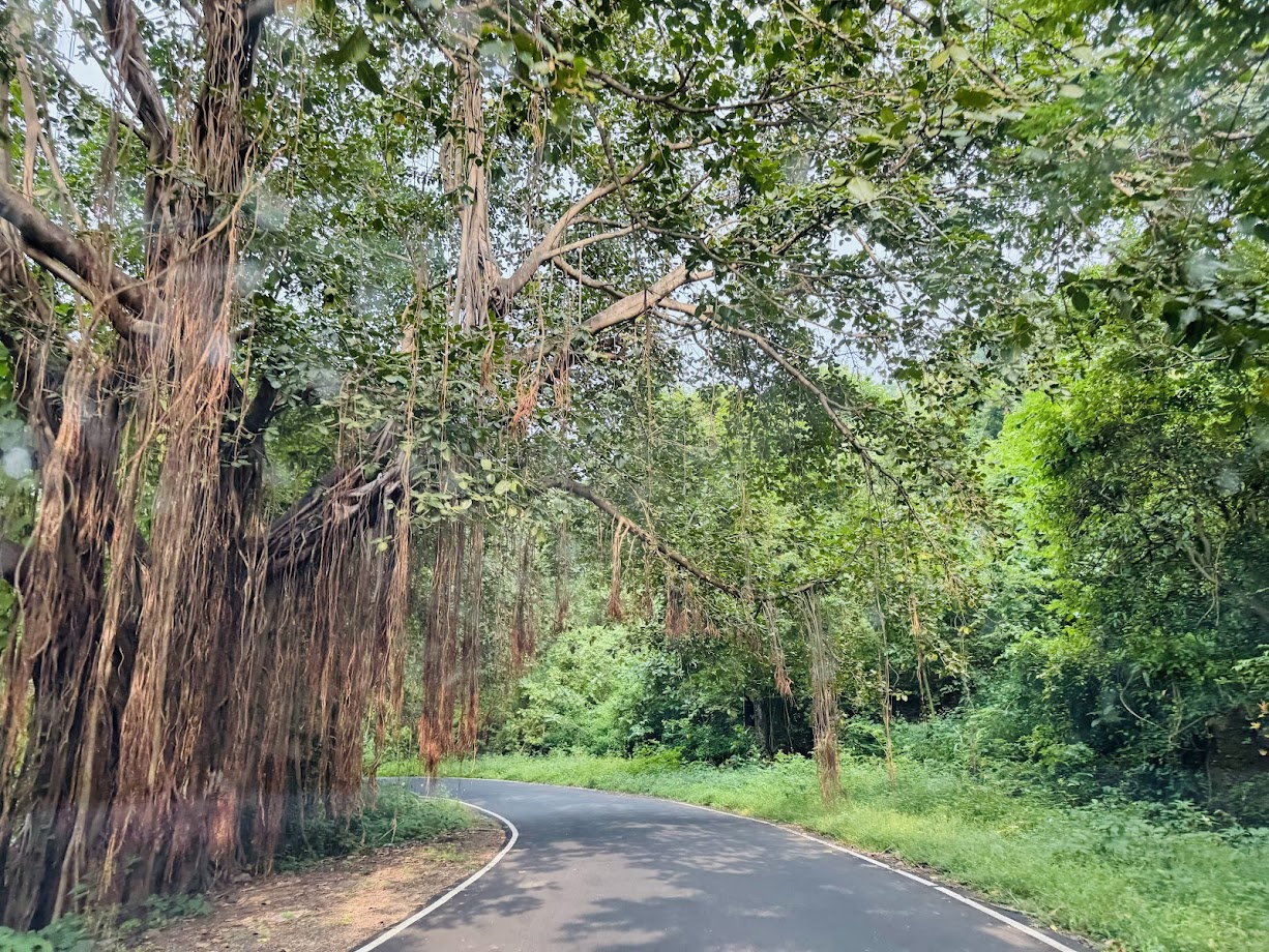 हिम्मतगडाच्या बाहेर आलो, पण त्याच रस्त्याने खाली परत जाऊ शकू याची खात्री नव्हती. त्यामुळे हिम्मतगडावरून जाणाऱ्या पठारावरच्या रस्त्याने आपण जाऊया असं आम्ही ठरवलं. हा वेगळाच रस्ता होता. तो कुठे नेत होता ठाऊक नव्हतं. पण आम्ही जात राहिलो. रस्ता अरूंद असला, तरी आजूबाजूची हिरवाई डोळ्यांना आणि मनाला सुखावत होती. हिरव्या रंगांच्या इतक्या छटा दिसत होत्या की डोळे आणि मन दोन्हीही तृप्त तृप्त होत होतं. कधी दुतर्फा वाऱ्याबरोबर डुलणारं जास्त उंचीचं गवत, तर कधी दोन्ही बाजूंनी असणाऱ्या पोपटीलालसर वेली, तर कधी दोन्हीकडे रांगेत उभी असलेली सुपारी आणि नारळाची उंचच उंच झाडं अशा रस्त्यावरून आम्ही जात होतो. मध्येच एखादी नदी लागत असे. मात्र पूर्ण रस्त्यात एकही दुकान, एकही मनुष्य दिसला किंवा भेटला नाही. गाडीत पिण्याचं पाणी घ्यायला विसरलो होतो आणि घशाला कोरड पडली होती. थोडं पुढे येताच एक टपरीवजा दुकान दिसलं आणि चक्क बिसलेरीच्या पाण्याच्या बाटल्या आम्हाला मिळाल्या. पाणी पिऊन पुढे निघालो. आता चांगला मोठा रस्ता आम्हाला लागला होता.